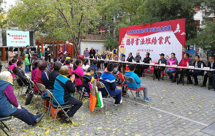10月28日,北京市東城區(qū)和平里街道興化社區(qū)國學(xué)書法班結(jié)業(yè)慶典在興化社區(qū)文化廣場(chǎng)舉行。原毛澤東主席的警衛(wèi)員83歲高齡的老革命家付明光及來自社會(huì)、軍休、街道、書協(xié)、民革、中央電視臺(tái)書畫頻道、美訊網(wǎng)、《中國藝術(shù)》雜志社、軍休報(bào)、北京社區(qū)報(bào)等領(lǐng)導(dǎo)參加結(jié)業(yè)式。