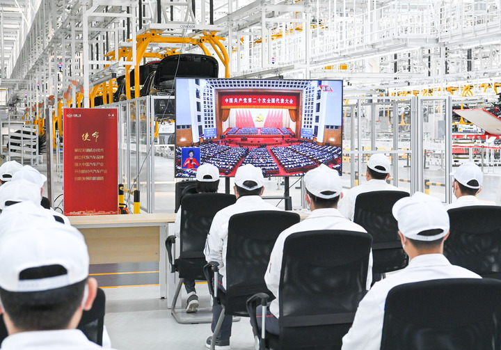 10月16日,在吉林省長(zhǎng)春市中國第一汽車集團(tuán)有限公司紅旗繁榮工廠,職工在收看中國共產(chǎn)黨第二十次全國代表大會(huì)開幕會(huì)。新華社記者 顏麟蘊(yùn) 攝