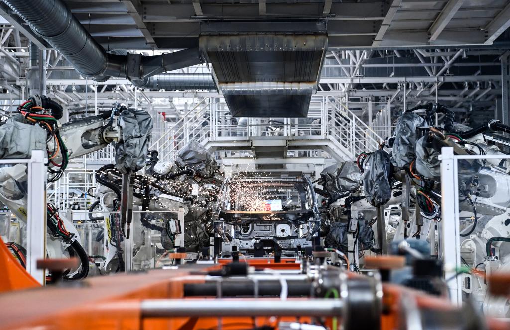 10月17日,在吉林長(zhǎng)春中國第一汽車集團(tuán)有限公司紅旗繁榮工廠焊裝車間內(nèi),焊裝機(jī)器人在生產(chǎn)線上焊接車身。新華社記者 顏麟蘊(yùn) 攝