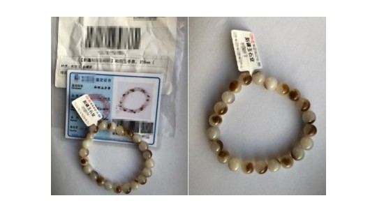 手串二,為一串白玉手串,直播間說是和田白玉,結(jié)果專家鑒定為,東北大白石,也就是一種產(chǎn)自東北的白色大理石,結(jié)構(gòu)粗糙,硬度不夠,根本就不是和田玉,更不要說新疆和田玉了,鑒定結(jié)果是假冒和田玉。