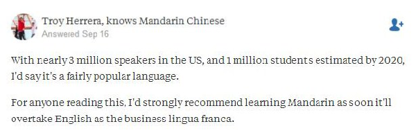 休斯頓的網(wǎng)友Troy Herrera說,美國有將近300萬說漢語的人,到2020年,估計還會有100萬人。所以,漢語是流行的語言?!拔覐娏医ㄗh大家學習漢語,因為作為商業(yè)語言,它的重要性可能超越英語?!?/span>