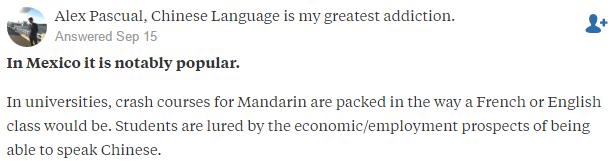 網(wǎng)友Alex Pascual說,在墨西哥,漢語也非常受歡迎。墨西哥大學里的漢語速成課程與法語和英語課程并駕齊驅。能說中文的學生們將獲得更廣闊的就業(yè)前景。