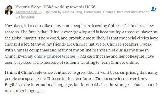 美國網(wǎng)友Victoria Weiya說,現(xiàn)在,似乎有越來越多的人在學習漢語。這是因為中國不斷發(fā)展壯大,在全球市場上有著重要的地位。如果中國跟世界的關聯(lián)性照這樣發(fā)展下去,那么,不久之后,將有越來越多人會講漢語?!半m然,我不確定漢語能否顛覆英語作為國際通用語言的地位,但是它很可能會超越其他大多數(shù)的語言?!?/span>