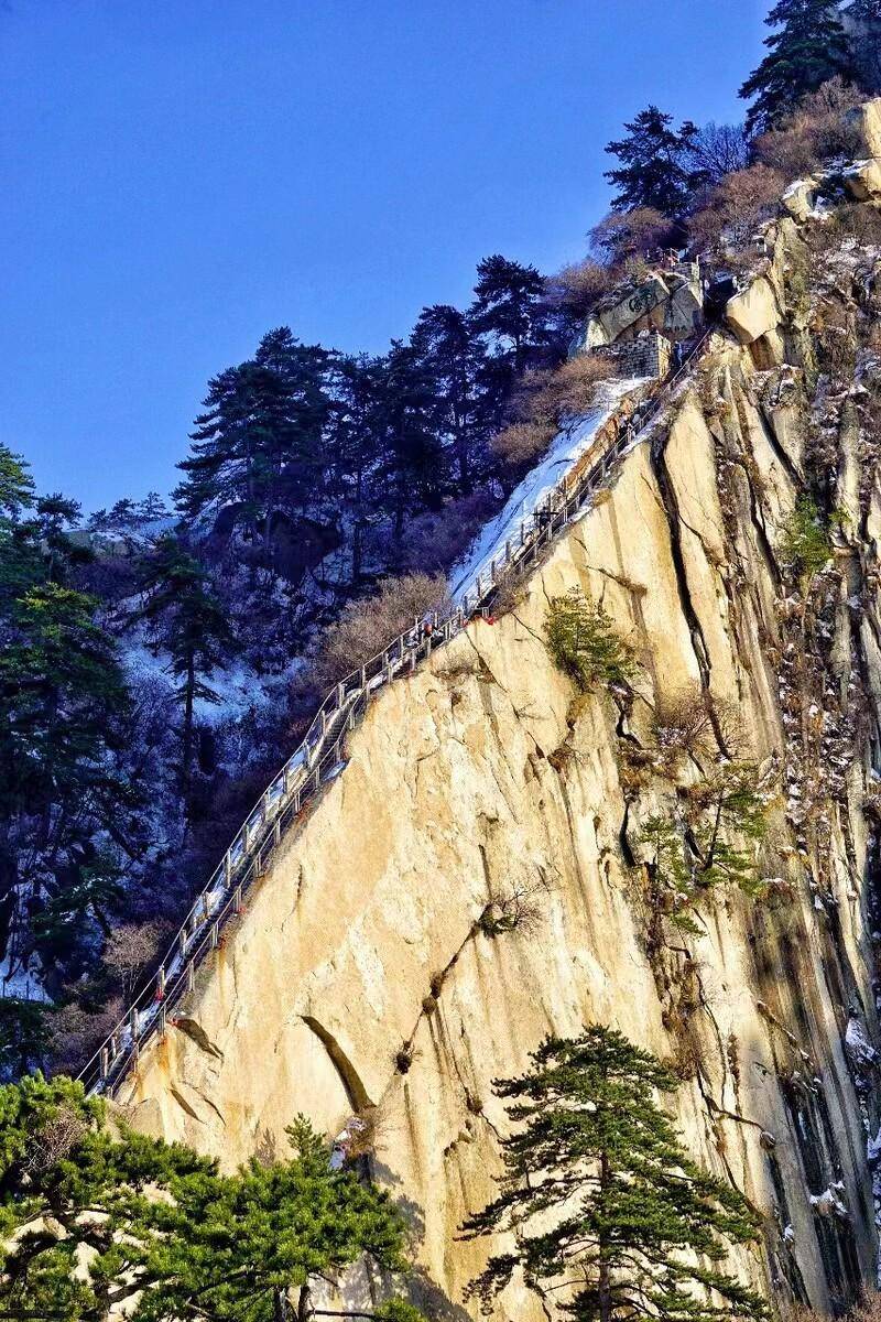 來到蒼龍嶺南口,由此北行,便是華山著名險道蒼龍嶺。如若登北峰制高點游覽,必須過此險道。我遂征詢夫人意見:“蒼龍嶺奇險無比,咱過還是不過?”我原以為夫人體弱膽小,肯定不敢冒險前行。萬沒料到,聽了我的問話,她竟堅定不移地說:“道險怕什么,既然來了,就上去看看,不留遺憾!”