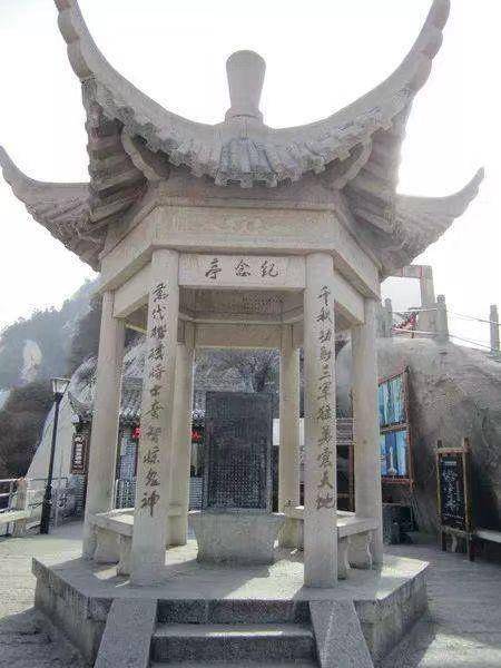 嶺脊北端,是一寬闊的平臺。首先映入眼簾的是一座六角形攢頂、飛檐斗拱的花崗巖石亭,亭中豎立著“解放華山紀念碑”。這里是當年解放軍八勇士智取華山英雄事跡的發(fā)生地。1949年,駐守此地的國民黨軍隊,憑借北峰奇險負隅頑抗。解放軍八勇士在當?shù)匕傩諑椭敢拢弥股?,借用竹竿、繩子,攀懸崖,跨絕壁,悄無聲息地登上北峰,一舉殲滅華山守敵,充分展示了解放軍戰(zhàn)士的機智勇敢,譜寫了可歌可泣的不朽業(yè)績,感動了一代又一代人。