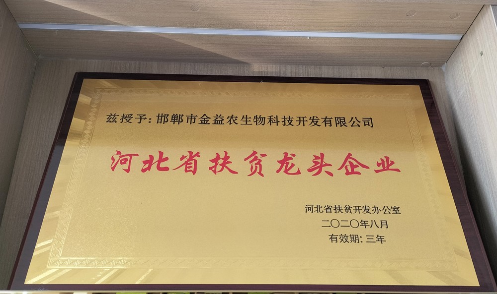 邯鄲金益農(nóng)生物科技開發(fā)有限公司先后被授予“國家級高新技術(shù)企業(yè)”、“河北省扶貧龍頭企業(yè)”、“河北省科技新型研發(fā)機構(gòu)”、“河北省四個一科技示范基地”、“邯鄲市農(nóng)業(yè)產(chǎn)業(yè)化重點龍頭企業(yè)”、“邯鄲市蒲公英產(chǎn)業(yè)技術(shù)創(chuàng)新戰(zhàn)略聯(lián)盟”、“邯鄲市蒲公英技術(shù)創(chuàng)新中心”。