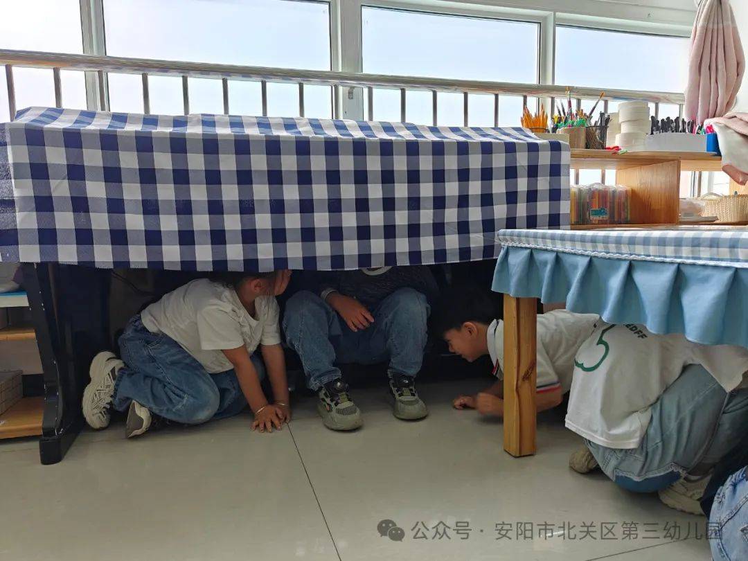 第一聲警報(bào)聲響起,地震演練正式拉開了序幕。全體師幼立刻停止一切活動(dòng),老師迅速有序地組織幼兒雙手抱頭、彎腰蹲下、降低重心,將身體藏在易于形成三角空間或者桌椅下等安全地方。