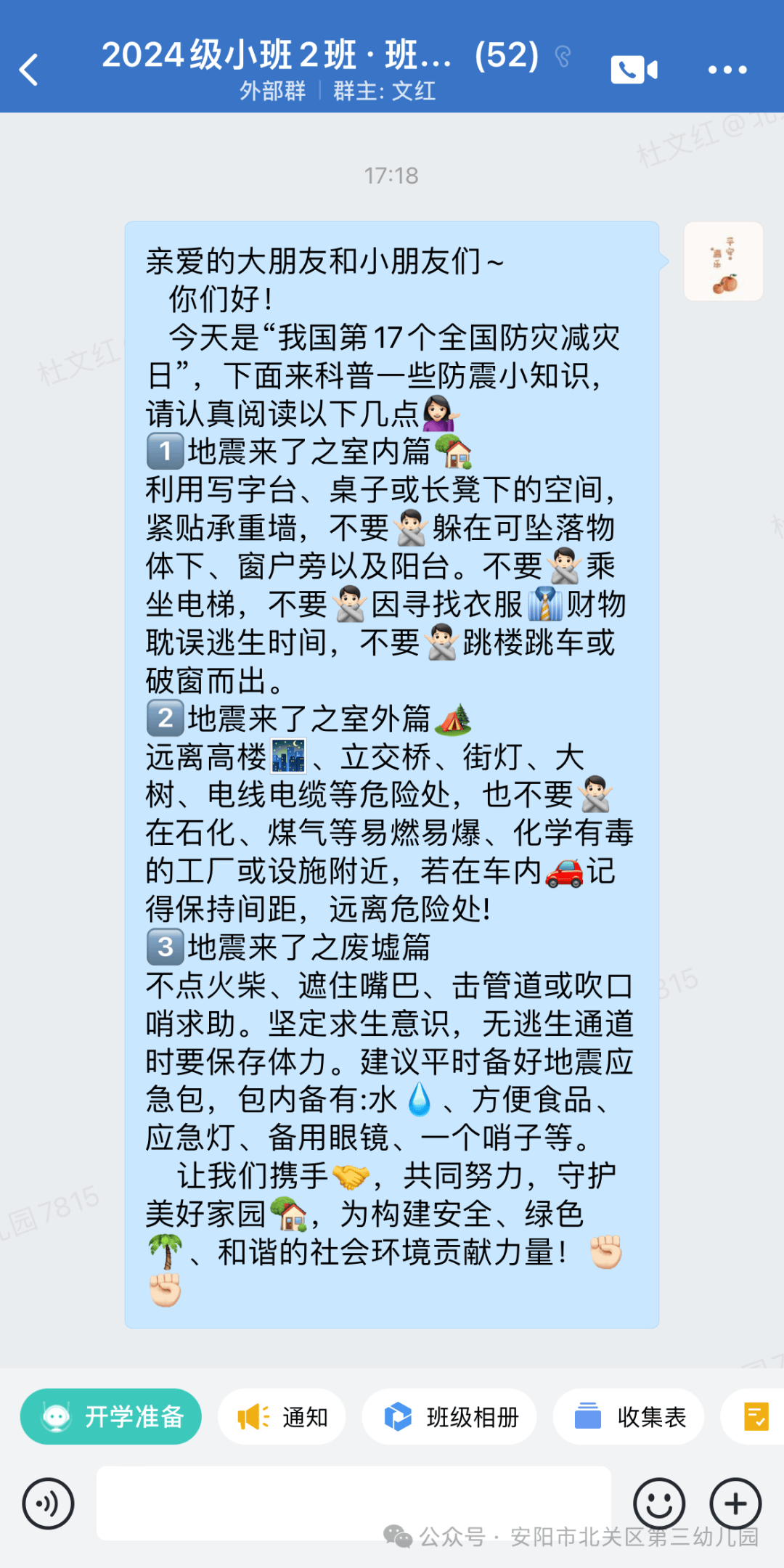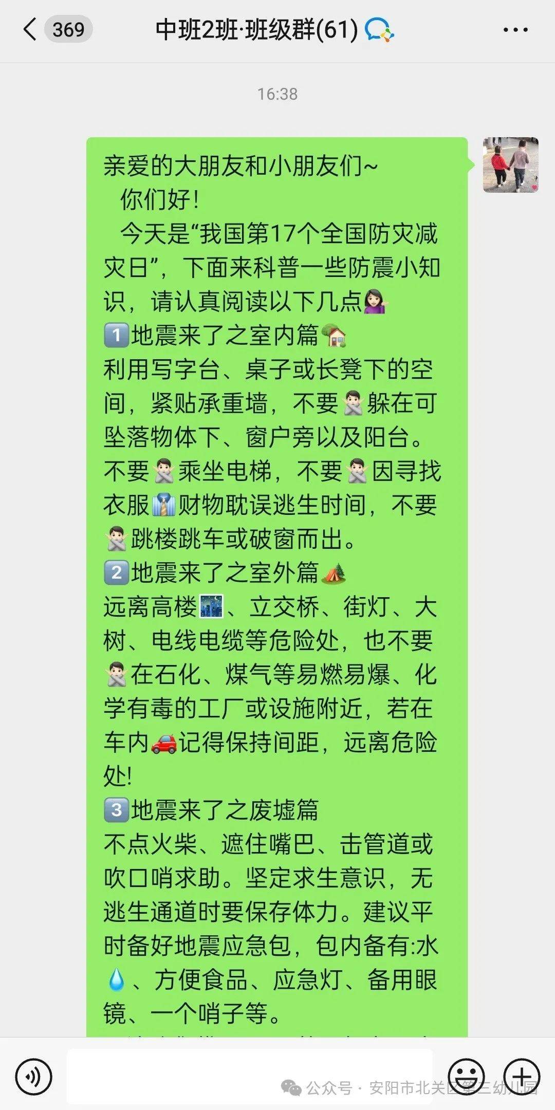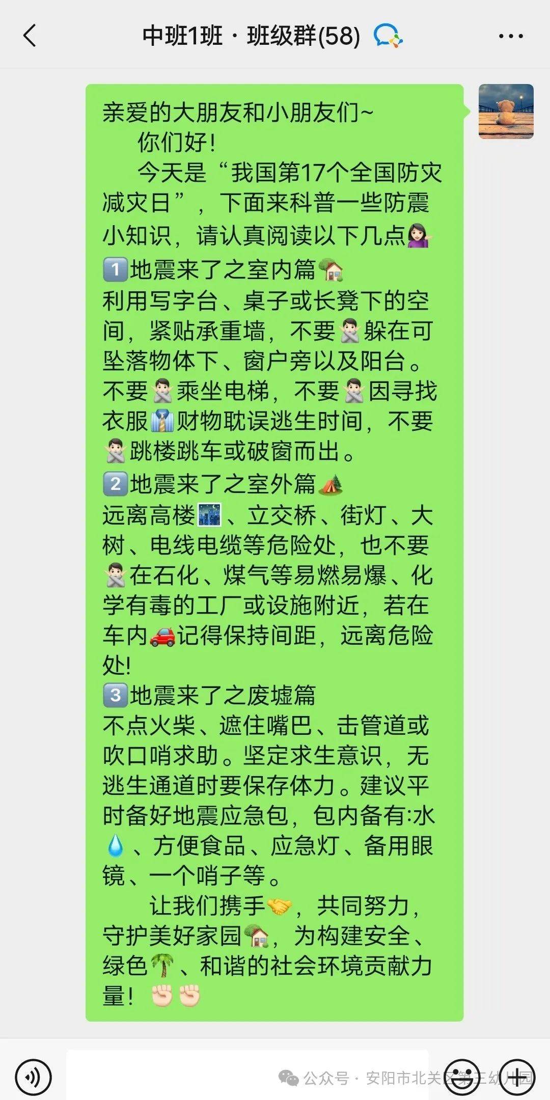 各班教師通過班級(jí)群廣泛宣傳防震減災(zāi)的知識(shí),切實(shí)做好宣傳工作,讓更多的人對(duì)自然災(zāi)害引起重視,學(xué)會(huì)更好的保護(hù)自己!