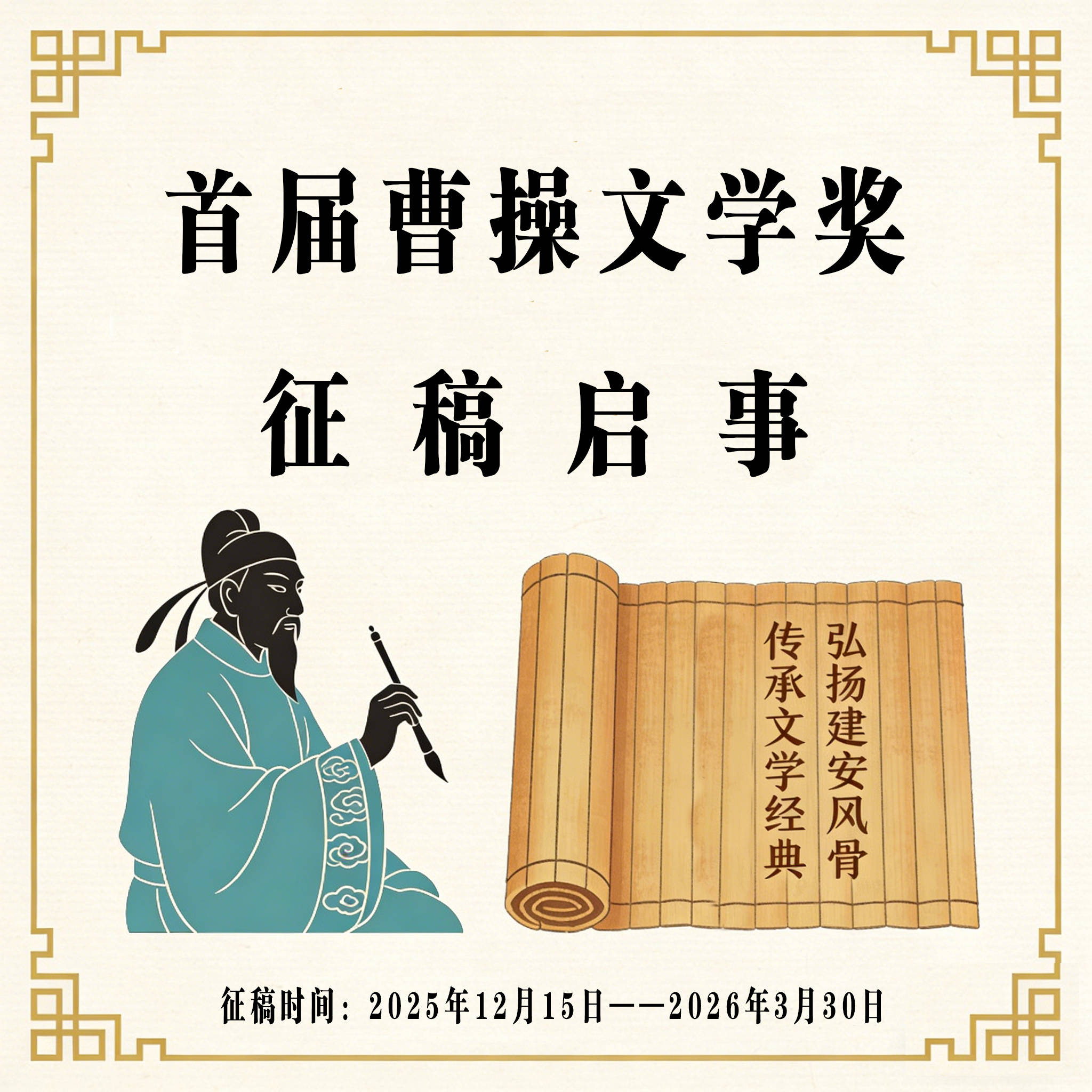 本次大賽主題為“書寫時(shí)代華章,傳遞人文力量”,聚焦多元生活與文化場景,可書寫山水風(fēng)光、人文歷史、民俗風(fēng)情、地域文化,探討時(shí)代變遷、人間溫情、生命感悟,也可深入挖掘曹操和建安文學(xué)相關(guān)的元素,展現(xiàn)新時(shí)代風(fēng)貌,弘揚(yáng)社會(huì)正能量。