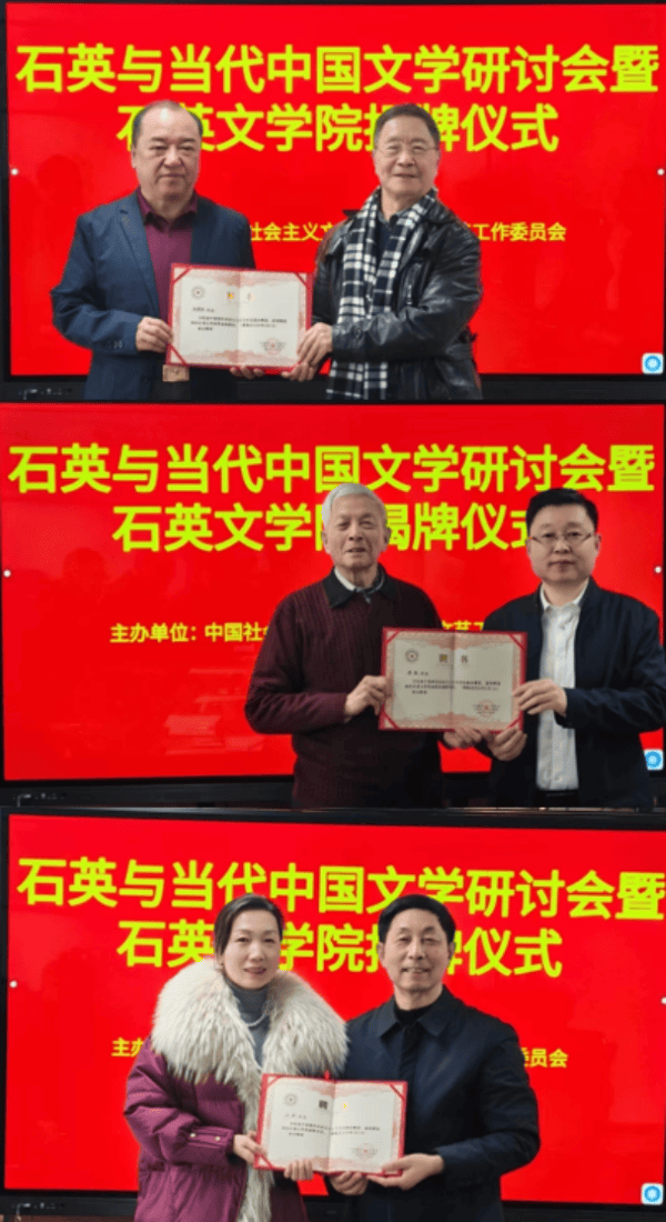 李正忠名譽會長(右)、祝東力顧問(左)共同為“石英文學院”揭牌,冷雪松常務(wù)副院長(中)接牌