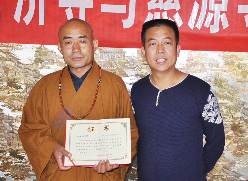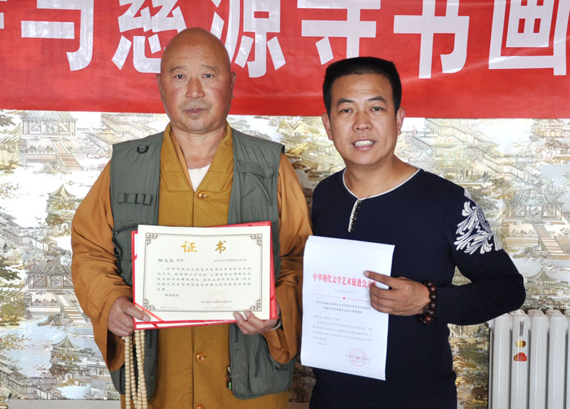 中華現(xiàn)代文學(xué)藝術(shù)促進(jìn)會(huì)執(zhí)行主席林臏向中國(guó)寺廟文化促進(jìn)會(huì)副會(huì)長(zhǎng)、山西太原市鳳凰山龍頭寺住持釋義顯頒發(fā)中華寺廟文化書畫院副院長(zhǎng)證書