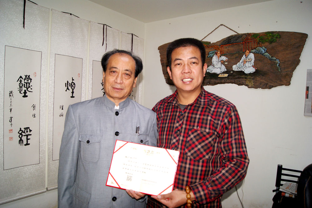 中華現(xiàn)代文學(xué)藝術(shù)促進(jìn)會(huì)執(zhí)行主席林臏向中華寺廟文化書畫院院長(zhǎng)柴廣利頒發(fā)證書