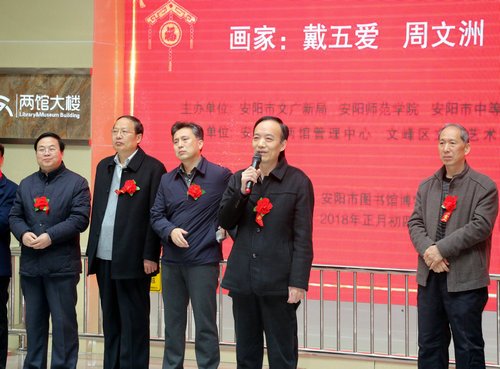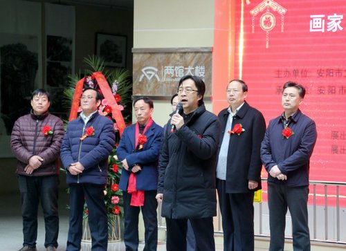 ??? 開幕式現(xiàn)場,河南省美協(xié)會副主席李明、安陽市文廣新局局長薛文明、安陽市美術(shù)家協(xié)會主席唐川府、參展作者代表戴五愛等嘉賓發(fā)表了熱情洋溢的講話。隨后,安陽市委常委、宣傳部部長常保利宣布了本次畫展開幕。